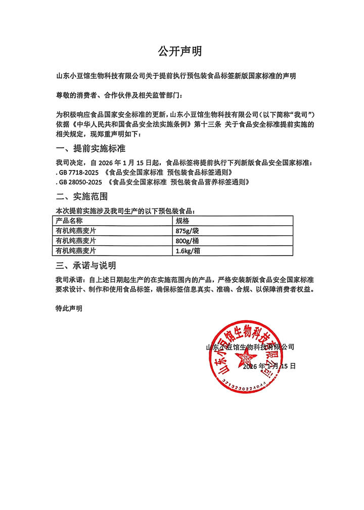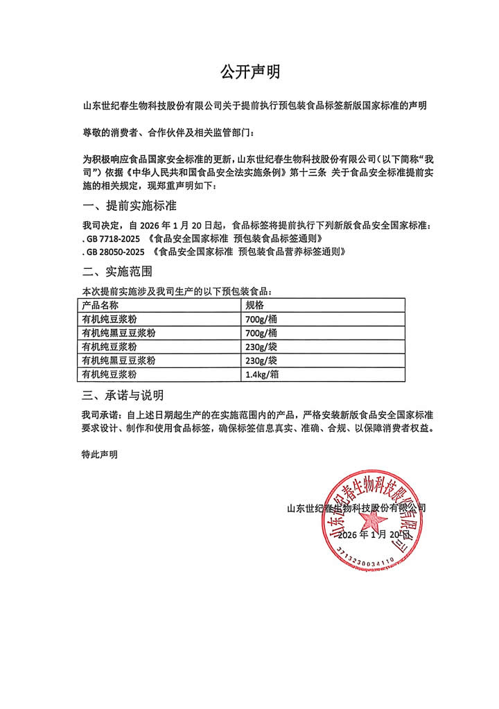 关于提前执行预包装食品标签新版国家标准的声明